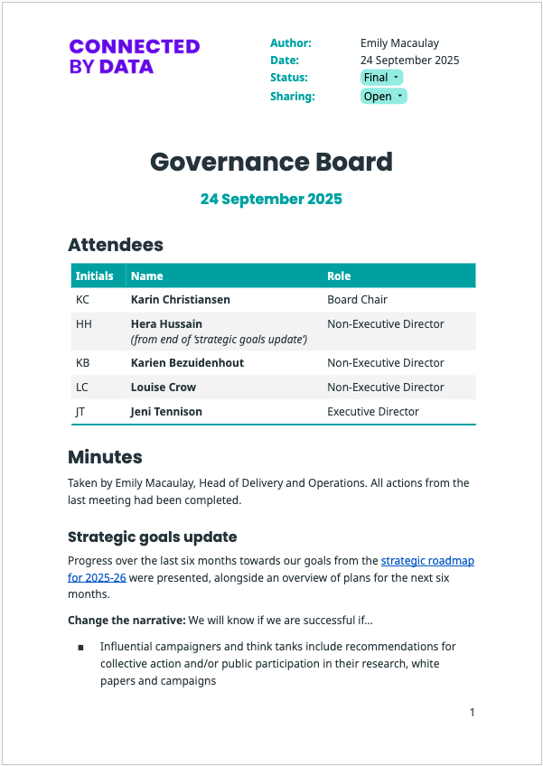 The Governance Board is complementary to the Advisory Board, which provides strategic advice. Unlike members of the Advisory Board, members of the Governance Board are Directors of the organisation and have official decision making powers and responsibilities.